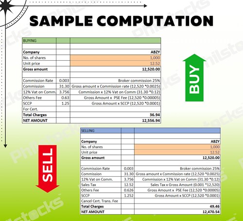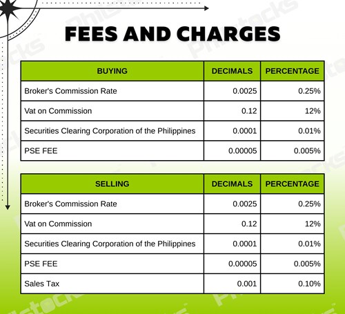 If you decide to sell your stock, the following costs are incurred: – a commission rate of 1.5% of the gross amount – 12% VAT on commission, – 0.6% sales tax of the gross amount, – PCD/ other fees, – SCCP fee, PLUS – Initial costs (for the processing fee of PDTC). All the fees will be deducted from your selling proceeds.